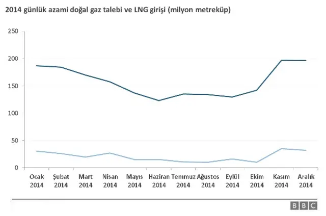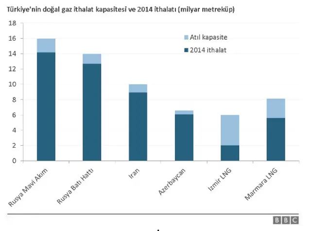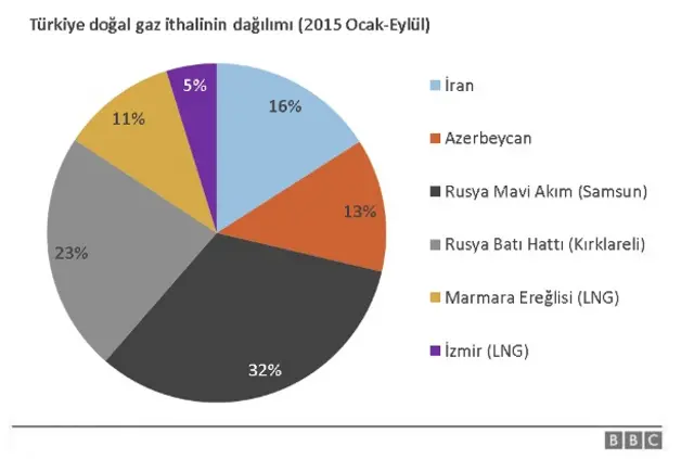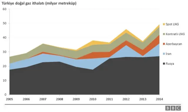 Toplam doğalgaz ithalatı (49,2 milyar metreküp) içinde Rusya’nın payı %55 (27 milyar metreküp). Türkiye, Rusya ile yaptığı uzun süreli anlaşmalar gereğince en az önümüzdeki 10 yıl boyunca yaklaşık bugünkü ithalat seviyesini korumak zorunda.