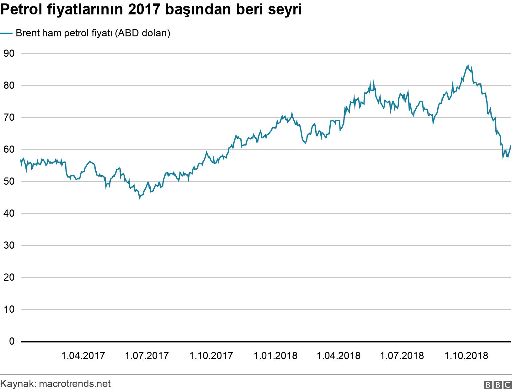 O tarihten itibaren yükselişe geçen temel uluslararası petrol fiyatı olan brent ham petrol fiyatı Ekim 2018'de varil başına 86 dolara ulaştı.