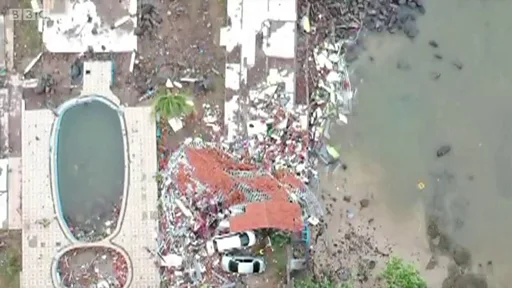 Cumartesi günü TSİ 17:30 sıralarında kıyıları vuran tsunami dalgaları sonucu bölgedeki yüzlerce bina da yerle bir oldu.