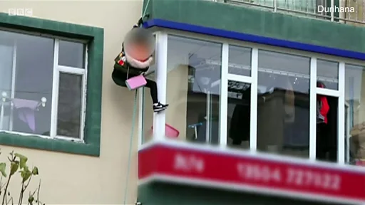 Çin'in Yanji kentinde, iki genç kadın bir apartmanın 3. katından, yırtılıp birbirine bağlanmış çarşaflarla pencereden aşağıya inmeye çalışıyor.