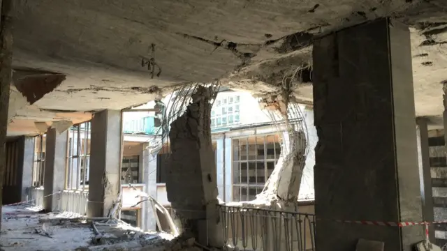 En büyük tahribat ana binada Başbakanlık makamı, CHP ve MHP gruplarının bulunduğu katta. Tavanlar çökmüş, parçalanan eşyalar, yıkılan duvarlar etrafa saçılmış.