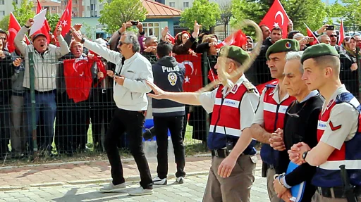 Sanıklar duruşma salonuna getirirken salonun dışındaki protestocular sanıklara urgan fırlattı.