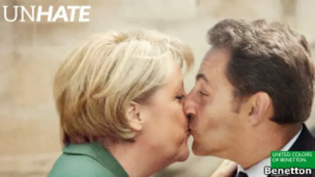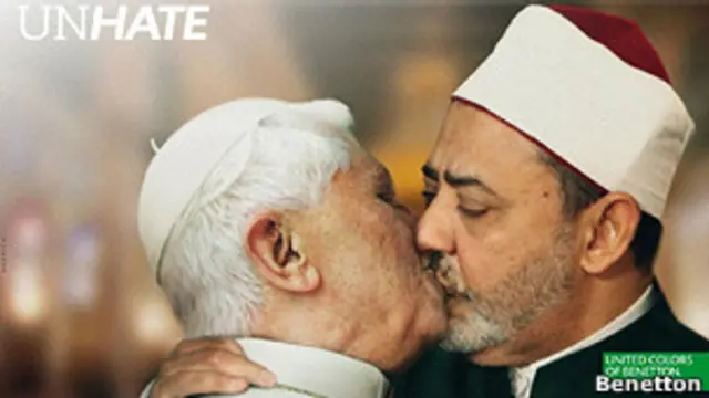 Papa ve İmam öpüşmesiyle, diğer önde gelen siyasi ve dini liderleri öpüşürken görüntüleyen fotomontaj afişler, Benetton'un dünya çapında başlattığı reklam kampanyasının bir parçası.