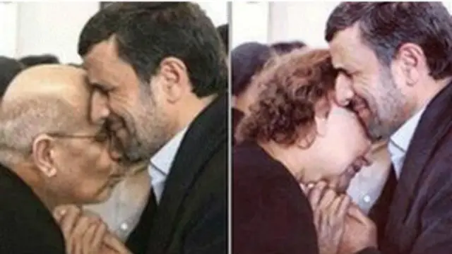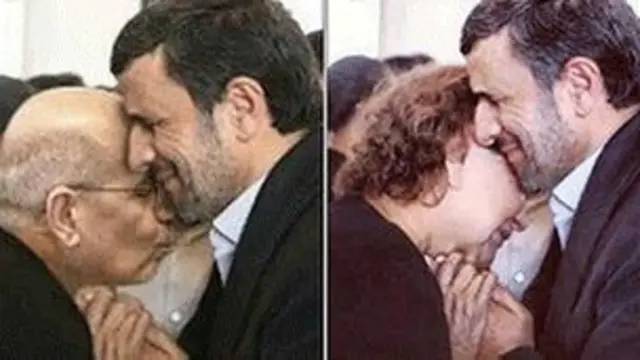 Fotoğrafın bu halinde Ahmedinecad ileri yaşlarda bir adamla aynı pozda görünüyor.