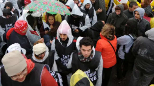Sık sık slogan atıyor binlerce kişi. "Kahrolsun Amerikan emperyalizm" en çok atılan sloganlar arasında. Bazen şiir okunuyor, bazen türküler söyleniyor hep bir ağızdan.