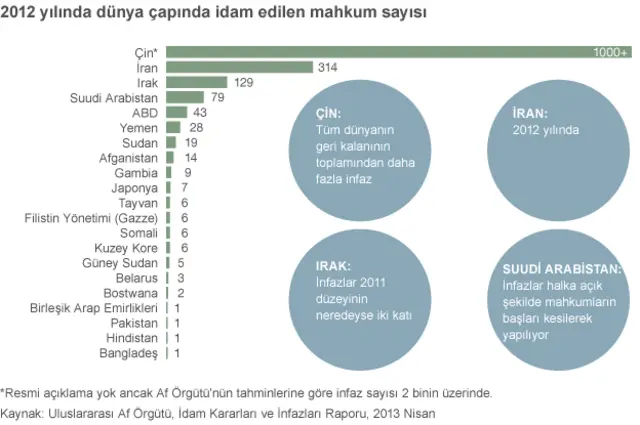 Dünyada idam cezasını uygulayan ilk beş ülke olarak raporda Çin, İran, Irak, Suudi Arabistan, Amerika ve Yemen olarak belirtildi.