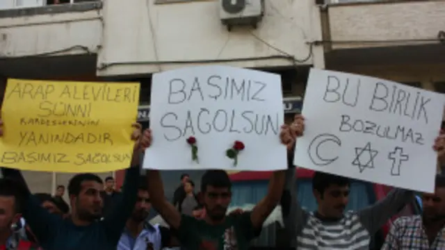 Bu mahalleden kent merkezine yürüyen göstericiler ‘Reyhanlı Halkı Yalnız Değildir’, “Reyhanlı’ya Uzanan Eller Kırılsın”, ‘Vali İstifa’ gibi sloganlar attılar, üzerinde ‘Arap Alevileri Sünni Kardeşlerinin Yanındadır’ yazan dövizler taşıdılar.