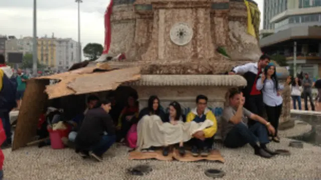 Az ilerideki Atatürk anıtındaki heykeller bayrak ve pankartlar nedeniyle görünmez olmuş. Mini barakalarda, gece nöbet tuttuğu anlaşılan gençler uyuyor.