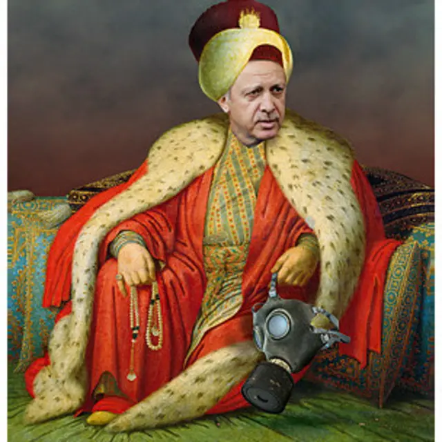 Derginin kapağında Erdoğan, kaftan giymiş, bir elinde tespih diğer elinde gaz maskesi bulunan bir padişah gibi resmediliyor.