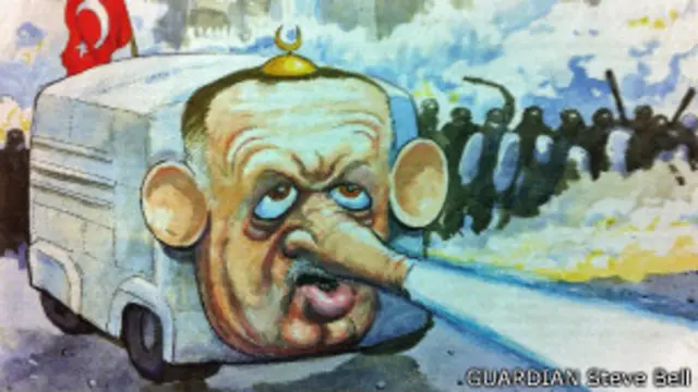 Bell'in karikatüründe, arka planda bir gaz bulutunun içinde elleri coplu polislerin siluetinin görüldüğü karikatürde, Başbakan Erdoğan Toplumsal Olaylara Müdahale Aracı, TOMA olarak resmedilmiş.