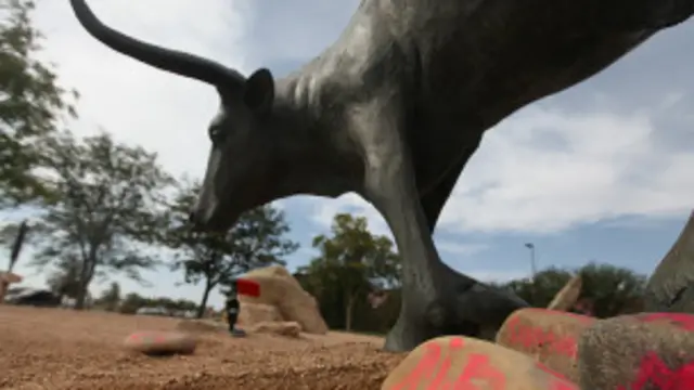 Miguel Martinez adlı gencin Lubbock kentindeki Teksas Teknoloji Üniversitesi'ndeki parkta, heykelin boynuzunun üzerine düşüp, göğsünden yaralandığı belirtildi.