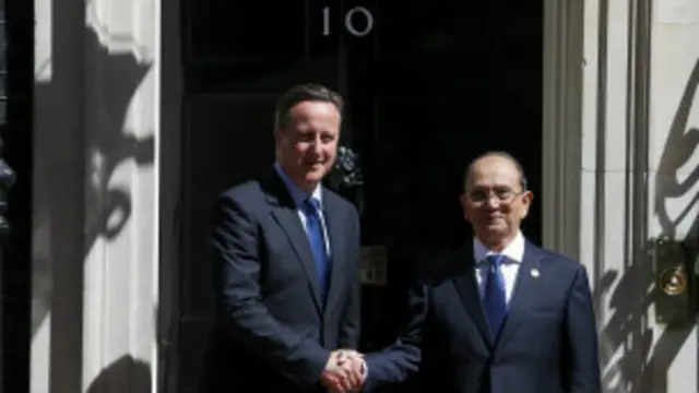 Cumhurbaşkanı, ticari ve askeri ilişkileri görüşmek üzere İngiltere'de. Kendisi Birmanya'nın ekonomisini geliştirmek isterken Batılı ülkeler de maden-zengini ülkeye yatırım yapmak istiyor.