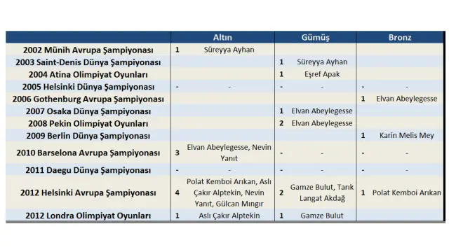 Aşağıdaki çizelge, 2002 Münih Avrupa Atletizm Şampiyonası’ndan itibaren Türkiye’nin belli başlı Avrupa ve Dünya Şampiyonaları ile Olimpiyat Oyunları’ndaki madalyalarının listesini ve madalyalı sporcuları gösteriyor.
