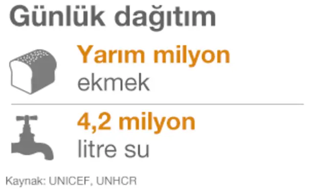 Her gün yarım milyon adet ekmek, 4 milyon litreyi aşkın su dağıtılıyor.