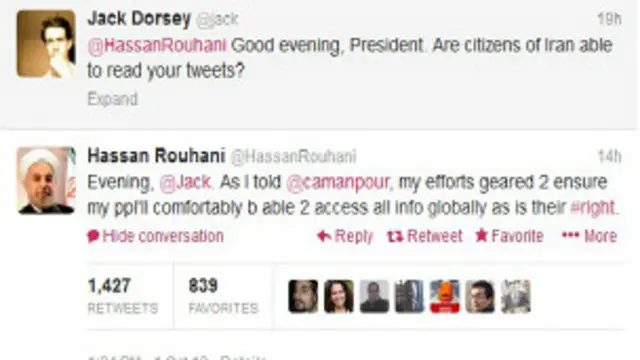 İran Cumhurbaşkanı Hasan Ruhani'nin kullandığı Twitter hesabı ile şirketin başkanı Jack Dorsey'in karşılıklı mesajlaşması, sosyal medyada "İran internet yasaklarını kaldıracak mı?" tartışmasını beraberinde getirdi.