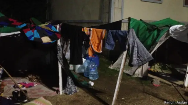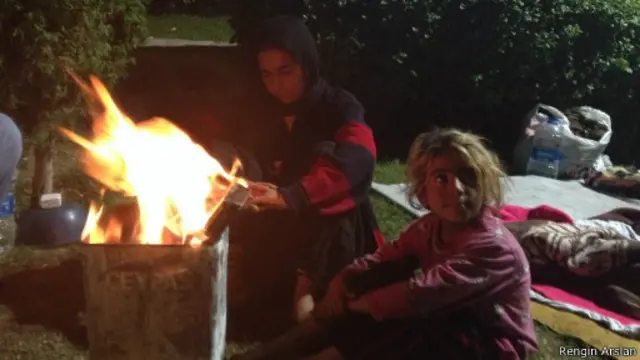 Teneke kutuların içinde yakılmış ateşin başına toplanmış, üçerli beşerli oturan aileler ve caminin duvarının dibine kurulmuş çadırlar var.