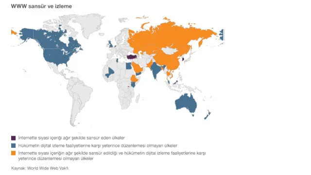 Raporda, endeksteki ülkelerin yüzde 30'unda siyasi içerikli muhtevanın bloke edildiği veya filtrelendiği ifade ediliyor.