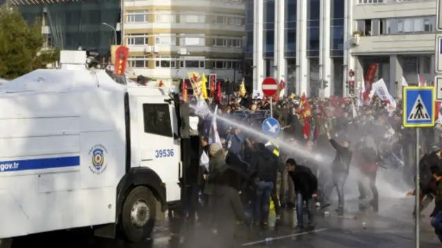 Miting henüz başlamadan ise göstericiler ve polis arasında, kısa sürede yatıştırılan gerginlik yaşandı; çevik kuvvet biber gazı ve TOMA’dan sıkılan su ile göstericileri dağıtmak istedi.