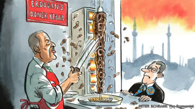 Peter Schrank’ın imzasını taşıyan karikatürde, Başbakan Erdoğan üzerinde Türk bayrağı olan bir önlükle, üzerinde ‘Demokrasi’ yazan bir döner kebabı paramparça kesiyor ve karşısındaki bir AB yetkilisi de memnuniyetsiz olduğu anlaşılan bir ifadeyle Başbakan Erdoğan’ı izliyor. Mekân olarak İstanbul’un seçildiği arka plandaki cami görüntüsünden belli olan karikatürde, Erdoğan’ın döner kestiği yerde “Erdoğan’ın Döner Kebapçısı” levhası asılı.