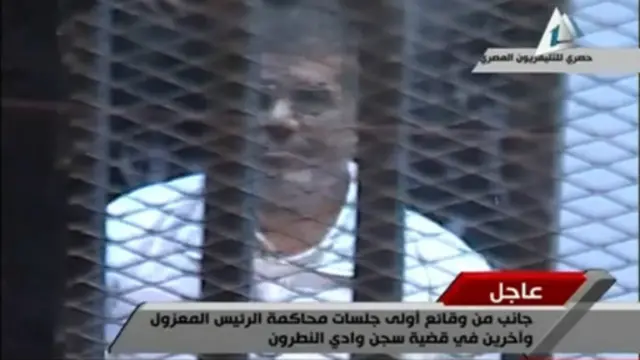 Mursi ile beraberindeki sanıklar mahkeme salonunda ses geçirmeyen camla çevrili bir kafesin içinde tutuldu. Mursi ancak el kaldırıp söz alarak konuşabiliyor.