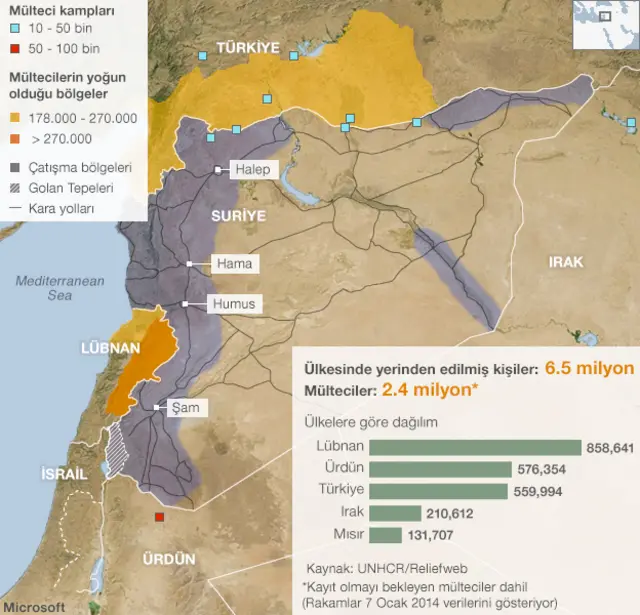 Suriye’deki savaştan kaçan yaklaşık 2,4 milyon Suriyeli bölge ülkelere sığındı, yaklaşık 6,5 milyon Suriyeli de ülke içinde mülteci konumuna düştü.