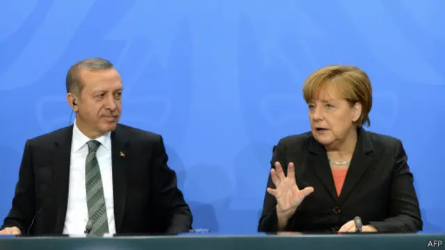 Merkel, Türkiye'nin AB üyeliği konusundaki görüşünü "Türkiye'nin AB üyeliğini ucu açık olarak görüyoruz" sözüyle dile getirdi.