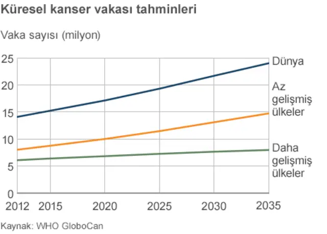 Dünya Sağlık Örgütü Uluslararası Kanser Araştırma Bürosu müdürü Dr. Chris Wild, BBC’ye yaptığı açıklamada “Küresel çapta kanserin yükü ağırlaşıyor ve bunun önemli bir bölümü nüfusun yaşlanması ve nüfusun artmasından kaynaklanıyor” dedi.