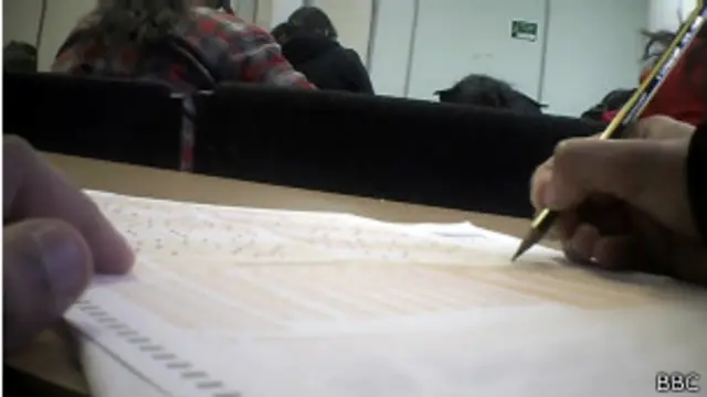 BBC'nin Panoroma programının gizli kamerayla çektiği görüntülerde bir oda dolusu adayın öğrenci vizesi alabilmek için girdikleri İngilizce sınavında sahtekârlık yaptıkları görülüyor.