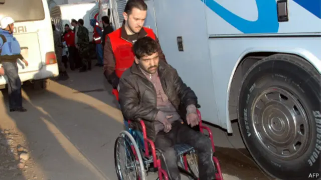 Koltuk değnekleriyle topallayarak yürüyenler, sedye üzerinde acı içinde kıvrananlar, mavi BM bayrağının asılı olduğu beyaz zırhlı araçlardan alınarak tekerlekli sandalyelere konulanlar…