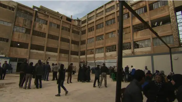 Silahlı muhafızların denetimindeki okula girmek için valilikten izin alıyoruz. Yaklaşık bir hafta önce BM’nin de desteğiyle yürürlüğe giren ‘insani ateşkes’ sonrası Humus’un tarihi kent merkezinden kaçan yaklaşık 300 Suriyeli erkek sorgulanmak için burada bekletiliyor.
