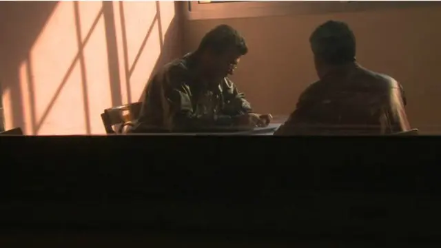 Kışın bu ılık gününde, sorgulanmayı bekleyen erkeklerin çoğu ya açık avluda oturuyork ya ileri-geri dolanıyor ya da kendilerini ziyarete gelen aileleriyle bir araya gelip kahve ve sohbete dalıyor.