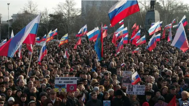 Son günlerde Kırım yarımadasında gerginlik artmış durumda; Moskova yanlısı politikacılar ve aktivistler mitingler düzenleyip Ukrayna'nın diğer bölgelerinden gelen "faşistler"e karşı topraklarını koruması için Rusya'dan yardım istiyor.