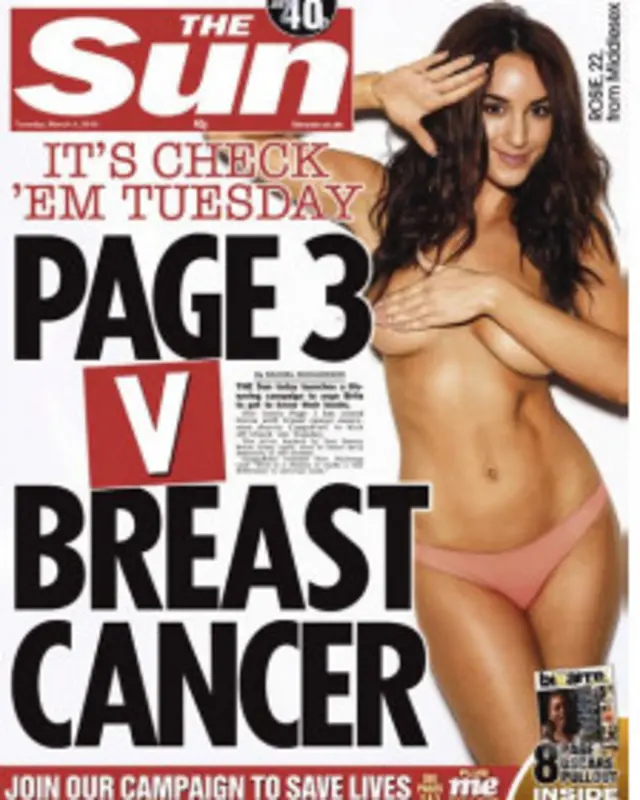 İngiltere’nin en çok satan bulvar gazetelerinden The Sun, çıplak kadın fotoğrafları yayımladığı üçüncü sayfasını, meme kanseriyle mücadele kampanyasına ayırıyor.