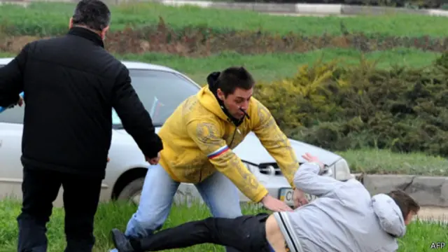 Kırım'ın Sivastopol kentindeki bir mitingde Ukrayna yanlısı aktivistler, Rus yanlısı gruplar tarafından dövüldü. Olay yerindeki bir BBC muhabiri, aktivistlere kamçı ile saldırıldığını ve çok çirkin sahneler yaşandığını söylüyor.