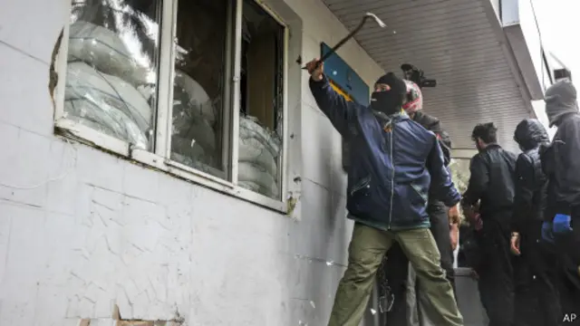 Eylemciler binayı koruyan polise molotof kokteyli ve taşla saldırırken polisin biber gazı ve ses bombasıyla karşılık verdiği gelen haberler arasında. Canlı televizyon görüntülerinde eylemcilerin silahlarını aldığı polisleri bina dışına çıkardığı görüldü.