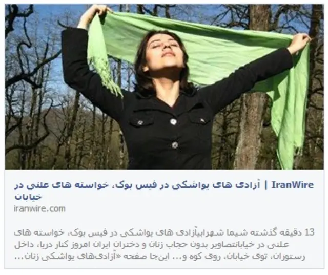 "Benim gizli özgürlüğüm" adlı Facebook sayfasında, İranlı kadınlar park ve cadde gibi kamusal alanlarda başları açık şekilde çektikleri fotoğraflarını paylaşıyor.