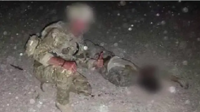 Kraliyet Hava Kuvvetleri'nde görevli bir asker, iki farklı fotoğrafta bir militanın kanlı cesedi yanına diz çöküp başparmağıyla 'tamam' işareti yaparken görülüyor.