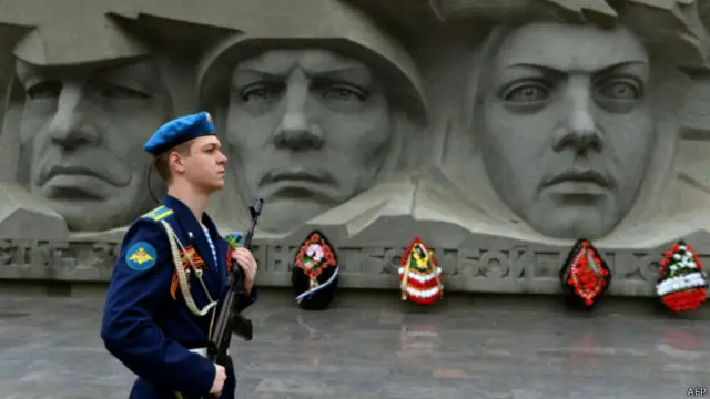 Başlarını öne eğmiş olarak saygı duruşunda bulunan Rus savaş gazileri, ölü bir askerin yanında yas tutan bir kadını canlandıran beyaz mermer heykele yaklaşıyor.
