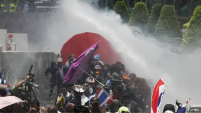 Tayland'da Anayasa Mahkemesi'nin Başbakan Yinglak Şinavatra'yı görevden almasından iki gün sonra başkent Bangkok'un sokakları yine karıştı. Polis, eylemcilere tazyikli su ve biber gazıyla müdahale etti.