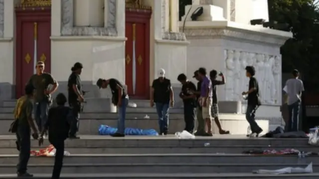 Görgü tanıkları, Bangkok Demokrasi Anıtı'ndaki kampta sabah saatlerinde patlama meydana geldiğini ve silah sesleri duyulduğunu söyledi.