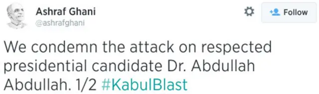 Abdullah'ın seçimlereki rakibi, Eşref Ghani, Twitter hesabından bir mesaj atarak, "Saygıdeğer başkan adayı Dr. Abdullah Abdullah'a yapılan saldırıyı kınıyoruz" dedi.