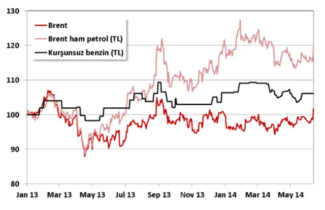 Aşağıdaki grafik, 2013 başından beri Brent tipi ham petrol (dolar ve Türk lirası olarak) ve kurşunsuz benzinin pompa fiyatını (Türk lirası) endeks olarak gösteriyor.