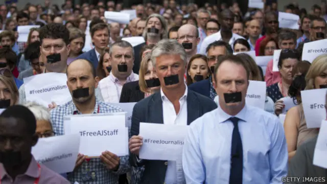 BBC'nin Londra merkezindeki yayın binası önünde bir araya gelen BBC'den ve diğer medya kurumların çalışanlar Mısır'daki mahkeme kararını protesto etti.