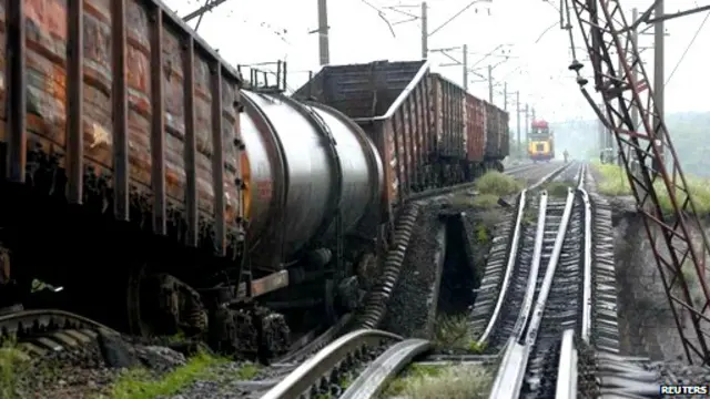 Köprüye yapılan saldırıdan sonra, yük taşıma treni köprü enkazının üzerinde asılı kaldı.
