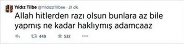 Geçen hafta Türkiye'de de benzer bir olay yaşandı. Şarkıcı Yıldız Tilbe'nin "Allah hitlerden razı olsun bunlara az bile yapmış ne kadar haklıymış adamcaaz" şeklinde bir tweet atması, sosyal medyada tepkiyle karşılanmıştı.