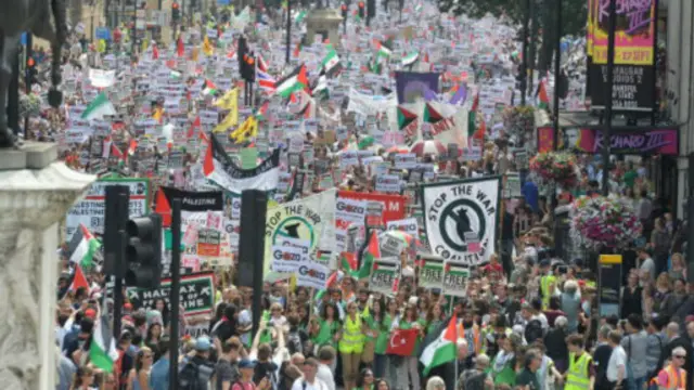 Binlerce protestocu İsrail'in Gazze saldırılarına son vermesi ve Filistin için "adalet ve özgürlük" çağrısıyla bugün Londra'da toplandı.