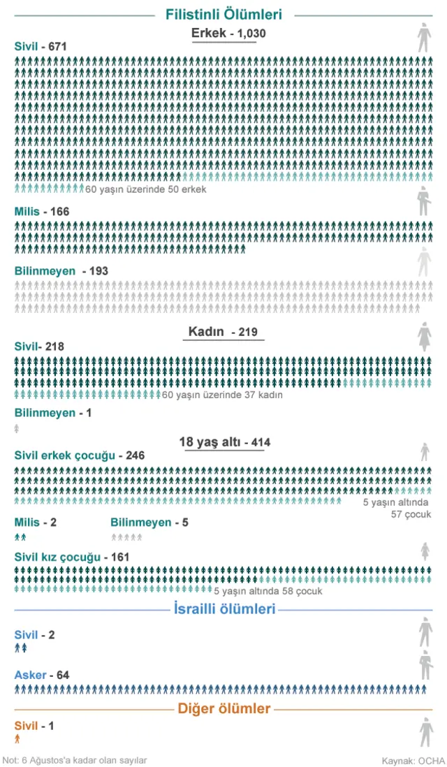 BM İnsani Yardım Koordinasyon Bürosu OCHA'nın 6 Ağustos'a kadarki verilerine göre İsrail'in saldırılarında 1890 Filistinli öldü.