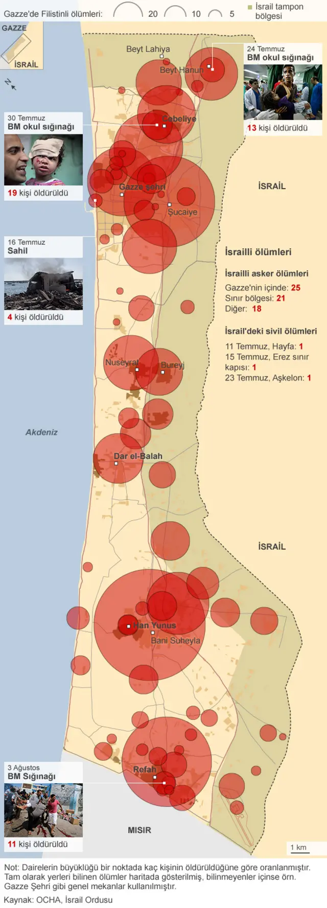 Filistinliler 40 kilometre uzunluğunda ve 10 kilometre genişliğindeki bir toprak parçası olan Gazze'nin neredeyse her yerinde öldürüldüler.