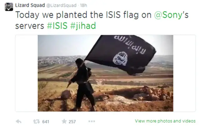 @LizardSquad hesabından paylaşılan mesajlarda ise, "Bugün Sony'nin sunucularına IŞİD bayrağını diktik" ifadesi yer aldı.