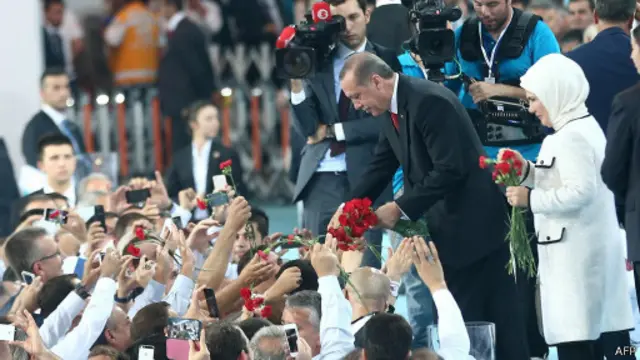 "Sayın Erdoğan, doğup büyüdüğü kent olan İstanbul'da çok zaman geçiriyor. Kendisi İstanbul'da da sembol yüklü bir hareketle, Atatürk'ün öldüğü 19. yüzyıldan kalma Versailles tarzı Dolmabahçe Sarayı'nda çalışmamayı tercih ediyor.